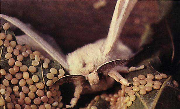 La femelle du Bombyx Mori au milieu de ses "graines"